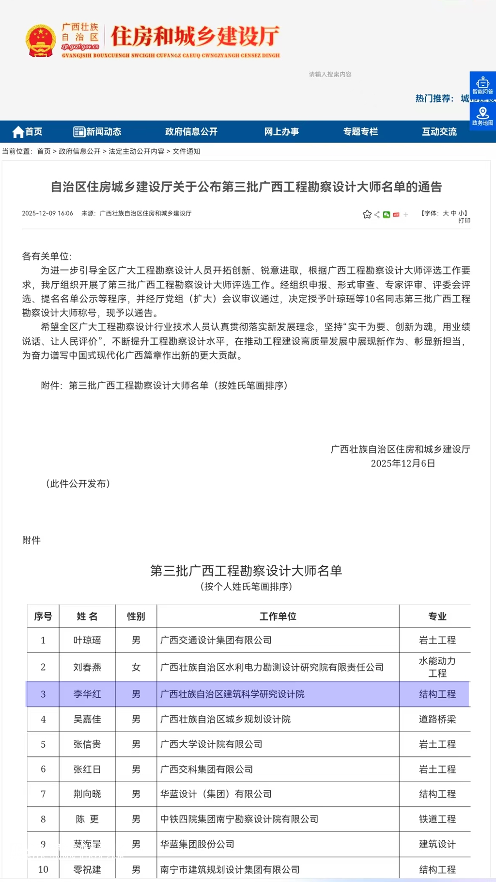 近日,自治区住房城乡建设厅正式公布第三批广西工程勘察设计大师名单,我院总工程师李华红同志凭借卓越的专业成就与行业影响力,光荣入选,被授予“广西工程勘察设计大师”称号。标志着我院累计拥有的“广西工程勘察设计大师”已达四位。这充分彰显了我院在工程勘察设计领域雄厚的技术实力与卓越的人才培养成效,形成了强有力的高层次技术人才矩阵。
