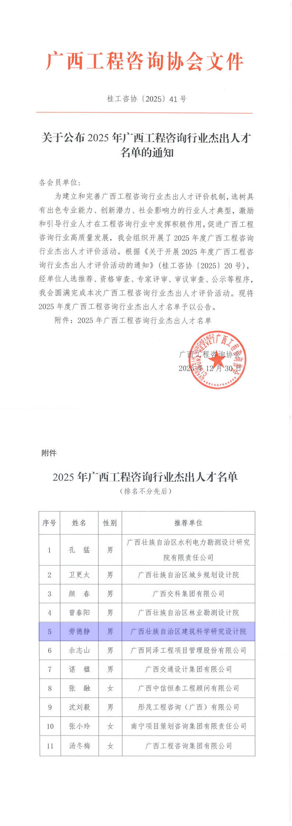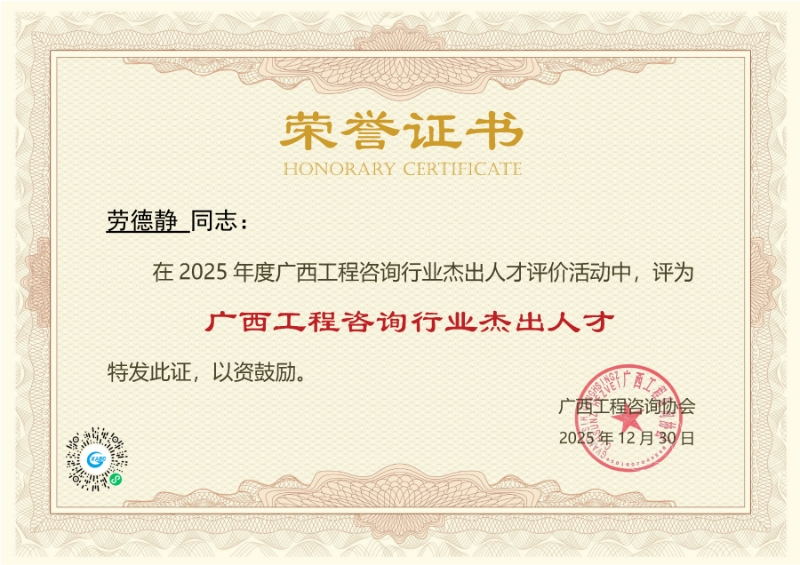“广西工程咨询行业杰出人才”是广西工程咨询领域的权威专业荣誉,经单位推荐、多轮严格审查评审及公示等规范程序,最终由广西工程咨询协会评选产生。该称号旨在认证行业内人才专业能力、创新潜力与社会影响力,代表着广西工程咨询领域的顶尖专业水准。